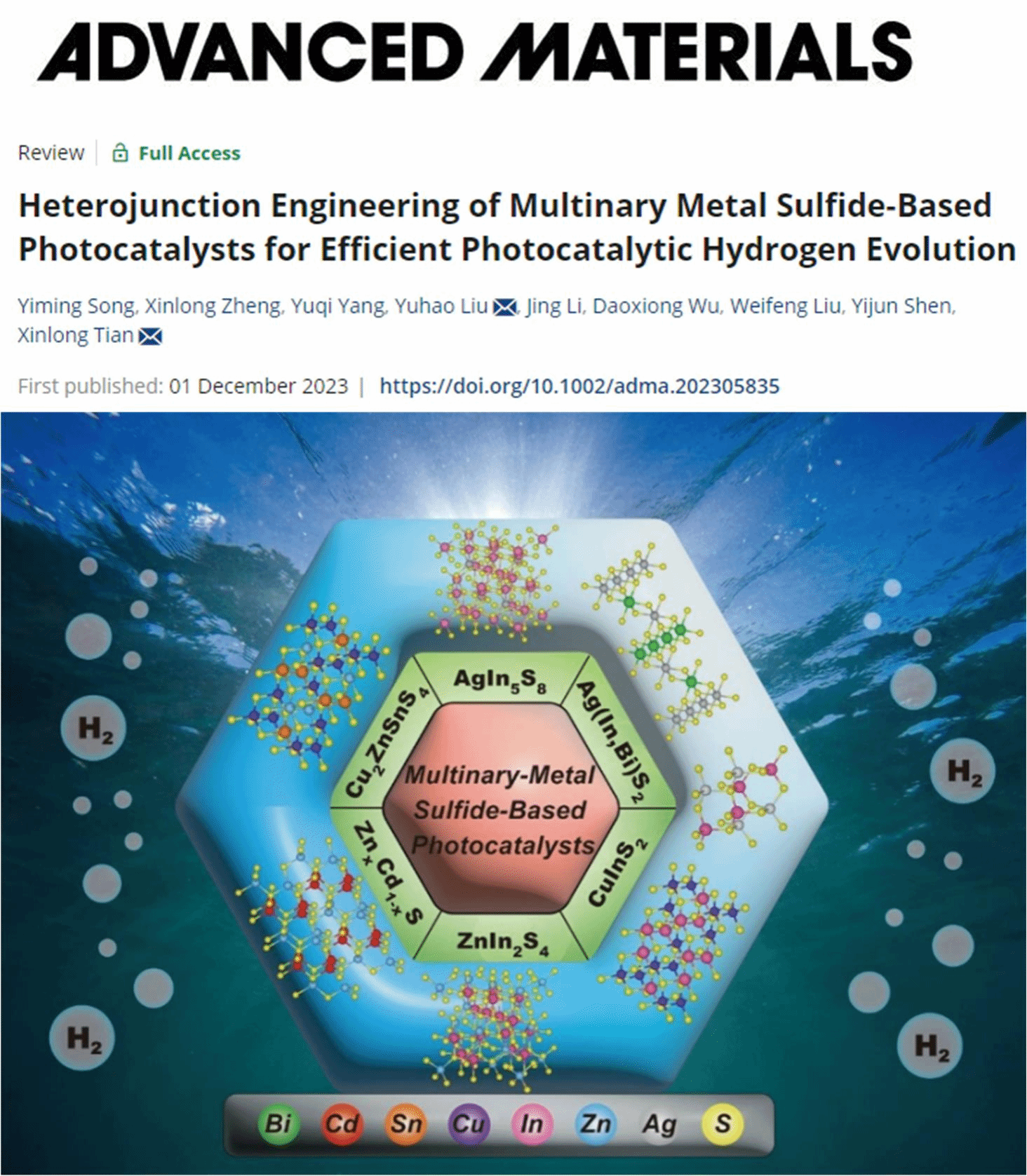 刘雨昊副教授所在团队在材料领域顶级期刊《Advanced Materials》发表题为《Heterojunction Engineering of Multinary Metal Sulfide-Based Photocatalysts for Efficient Photocatalytic Hydrogen Evolution》的综述论文。番茄直播