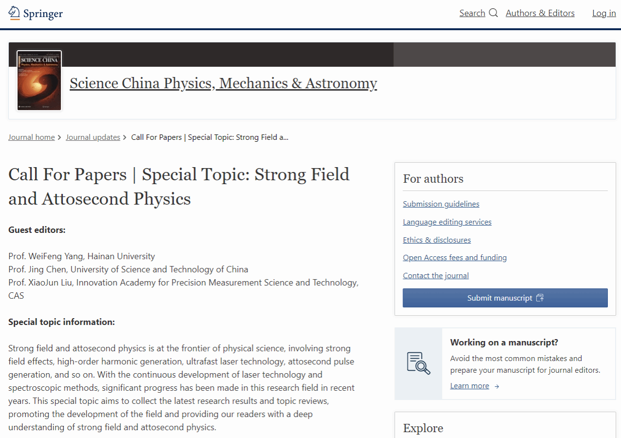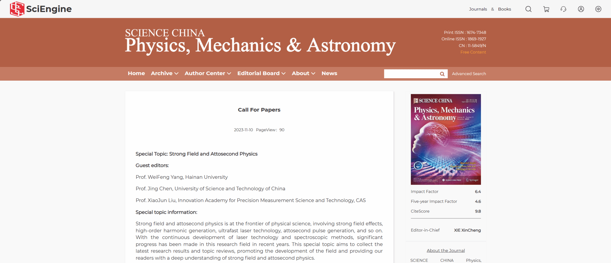 SCIENCE CHINA Physics,Mechanics & Astronomy推出的“Strong Field and Attosecond Physics”专栏主题包括强场物理基础原理与现象研究、高次谐波产生及应用、阿秒脉冲生成与检测、阿秒物理学中的光谱技术、以及强场物理与阿秒科学相关的交叉学科研究。专栏亦于springer进行同步开放与宣传。此平台将成为科研人员和学者交流的中心,诚邀世界各地高校及科研单位的专家与学者来稿,共同助力强场物理与阿秒科学领域的进步与创新。