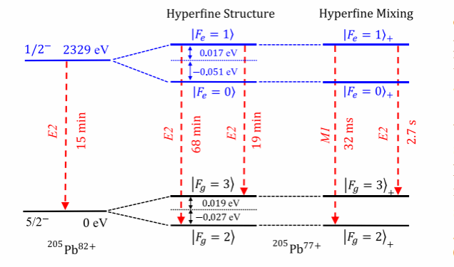大家普遍认为超精细混合效应在具有更高激发能的其他原子核中会非常微弱,因此超精细混合效应的研究主要集中在钍-229原子核。但是,通过发展更加完整的理论框架,该论文提出了一种新的超精细混合机制,大大拓展了超精细混合效应的应用范围。已知的超精细混合机制只利用了一个电子态(比如钍-229情况下的1s电子态),而这种新机制利用了两个电子态,如果这两个电子态之间的能量差与原子核能级差匹配的话(同时角动量也匹配),则可能出现显著的超精细混合效应。基于这个新的机制,该研究预测在类硼铅-205离子(铅-205的77价离子)中,由于2p电子的1/2和3/2态能量差(2,356 eV)与该原子核第一激发态能量(2,329 eV)相近,将产生显著的超精细混合效应。计算结果表明,超精细混合效应会导致该原子核第一激发态寿命从原来的15分钟缩短4个数量级,降至32毫秒。