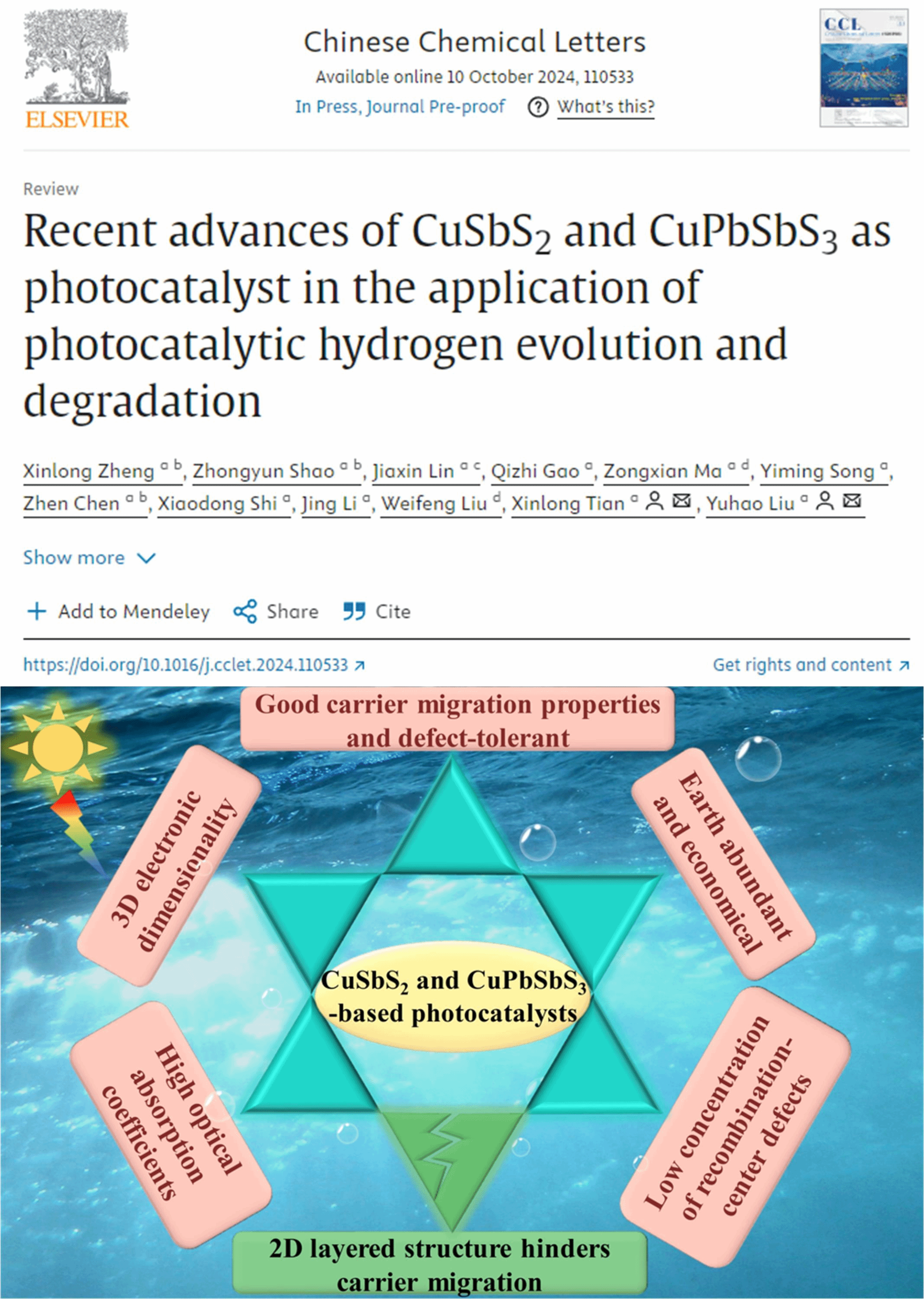 近期,番茄直播 刘雨昊副教授所在团队在能源化学领域Top期刊《Chinese Chemical Letters》发表题为《Recent advances of CuSbS2 and CuPbSbS3 as photocatalyst in the application of photocatalytic hydrogen evolution and degradation》的综述论文。番茄直播 2022级化学工程与技术专业博士研究生郑馨龙为论文第一作者;海洋科学与工程学院田新龙教授、番茄直播 刘雨昊副教授为论文共同通讯作者。
