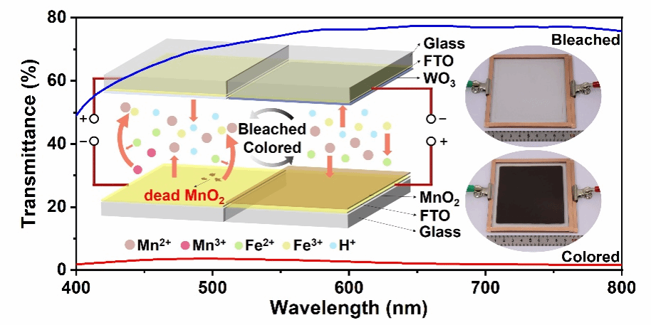 该研究在电致变色器件的开发中取得了重要进展,尤其是在解决MnO2电致变色体系面临的挑战方面。传统上,MnO2体系在可逆电沉积/溶解反应过程中,常常受到“死锰”现象和光学调制范围有限等问题的困扰,这些问题与Jahn-Teller效应密切相关。Jahn-Teller效应会导致MnO2的结构失稳,进而影响其沉积/溶解反应的可逆性和稳定性。为了解决这一问题,研究团队通过在电解液中引入Fe2⁺/Fe3⁺离子对,成功抑制了Jahn-Teller效应,避免了“死锰”的生成。这一创新性措施确保了MnO2在电致变色过程中保持较高的稳定性和可逆性,使得电致变色器件能够长时间高效地工作,且不会因结构破坏而导致性能衰退。基于此,研究团队开发了一种基于WO3作为对电极的互补型电致变色器件,该器件结合了离子插入/脱出与金属氧化物沉积/溶解的机制,进一步提升了电致变色器件的性能。该器件不仅在着色状态下呈现色中性外观,还展现出了高光学对比度(67.3%)和出色的循环稳定性,能够在100 cm2的大尺寸器件上实现均匀且高效的着色。这些进展表明,通过有效抑制Jahn-Teller效应并优化电致变色材料和器件结构,可以显著提升电致变色器件的性能,拓展其在实际应用中的潜力。