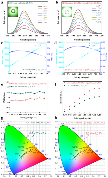 图 1. 基于Mg2+掺杂后的Cs3Cu2Cl5纳米晶制备绿光LED的器件表现。