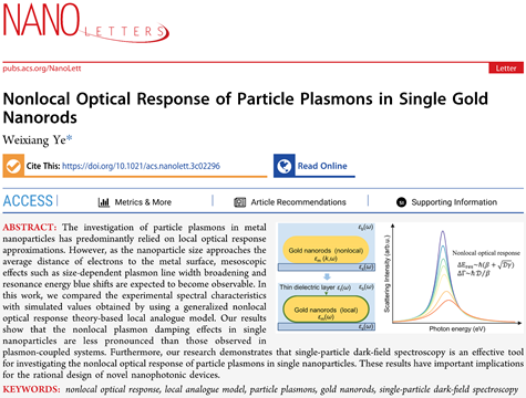 近日,番茄直播 、理论物理研究中心教授叶巍翔在微纳光学领域的顶级学术期刊《纳米快报》(Nano Letters)上以单一作者发表了题为《单颗粒金纳米棒中的等离激元非局域光学响应》(Nonlocal Optical Response of Particle Plasmons in Single Gold Nanorods)的学术文章。