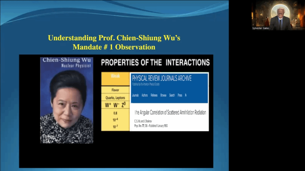 荣誉教授冯达旋的邀请,美国物理学会前任主席、美国科学院院士Gates教授(SYLVESTER JAMES GATES, JR.)通过Zoom视频会议进行了题为“C.S. Wu (吴健雄): Mandated Observer of Nature's Secrets”的学术报告,标志着该论坛的开幕。