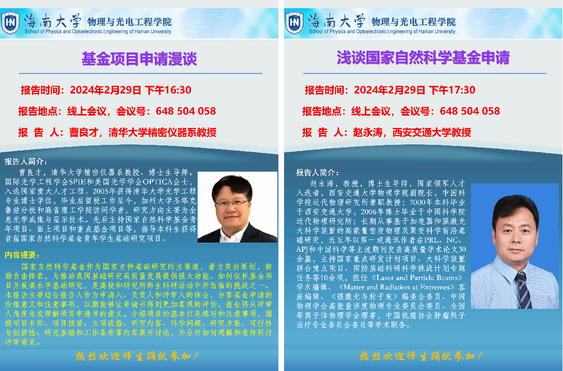 为提高我院2024年国家自然科学基金申报质量和立项率,实现学院今年的申报愿景和目标。学院于2024年2月29日线上召开了国家自然科学基金申报点评会,会议由副院长杨玮枫主持,学院特邀清华大学精密仪器系教授曹良才和西安交通大学物理学院副院长赵永涛教授担任点评专家,对我院教师的国家自然科学基金申请书进行逐一点评。