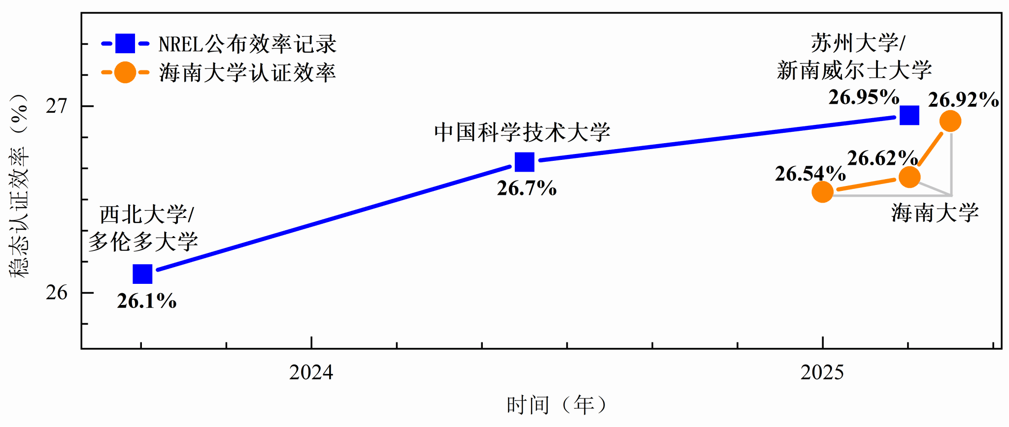 番茄直播 新能源光电材料与器件团队在新型光伏器件研发中取得阶段性进展。该团队自主研发的钙钛矿太阳能电池经国际权威的中国国家光伏产业计量测试中心验证,稳态认证效率由2024年12月的26.54%迅速提升至2025年3月的26.92%,直追美国国家可再生能源实验室(NREL)最新公布的单结钙钛矿太阳能电池世界最高效率纪录(26.95%)。钙钛矿太阳能电池认证效率是国际公认的核心技术指标,由权威机构在标准测试条件下验证,其微小提升往往意味着材料设计、器件工艺等底层技术的实质性突破,因而成为全球钙钛矿研发团队竞逐的重要指标。该进展标志着番茄直播 新能源光电材料与器件团队在钙钛矿光伏器件制备技术水平上跻身国际先进行列。